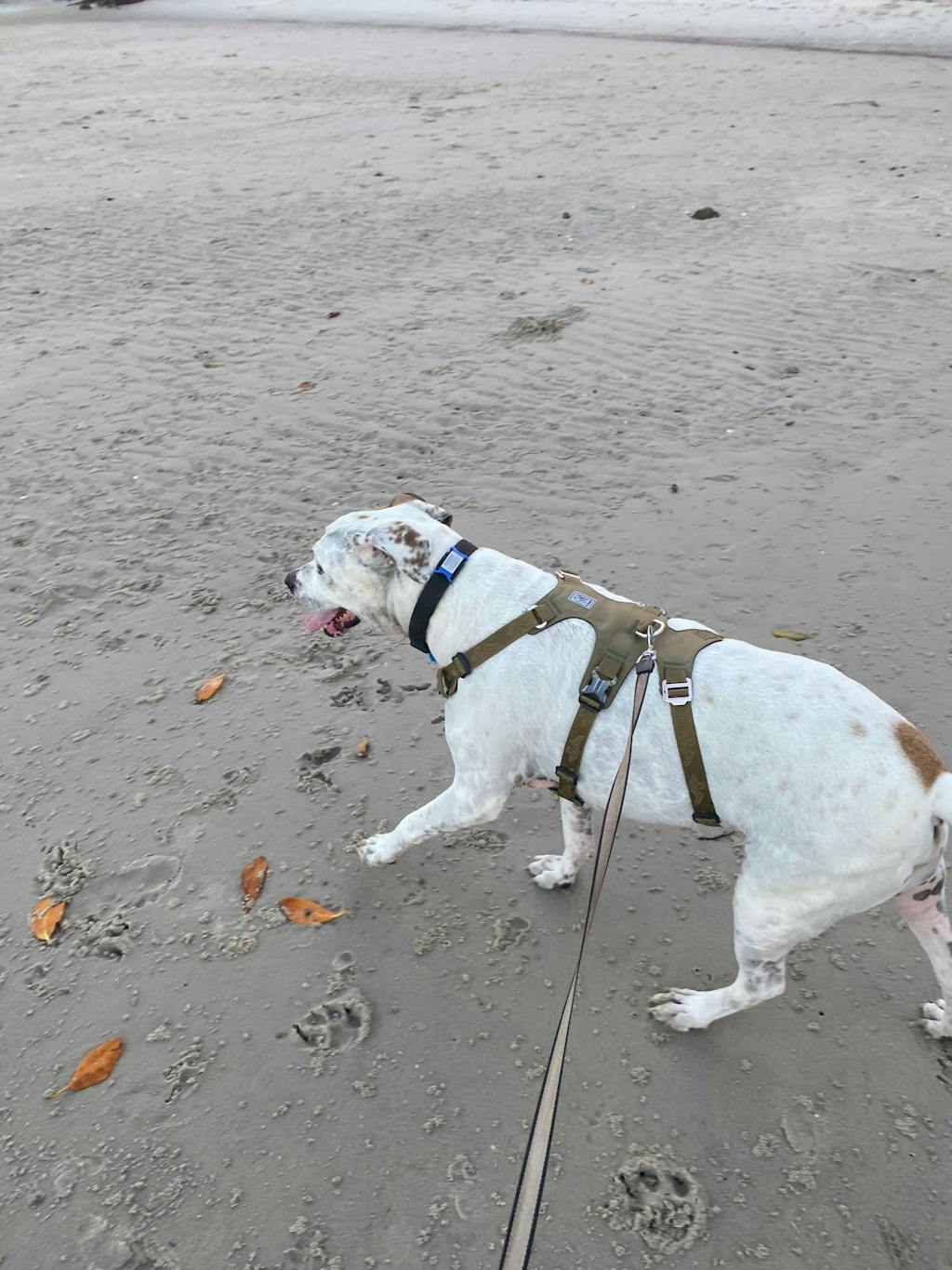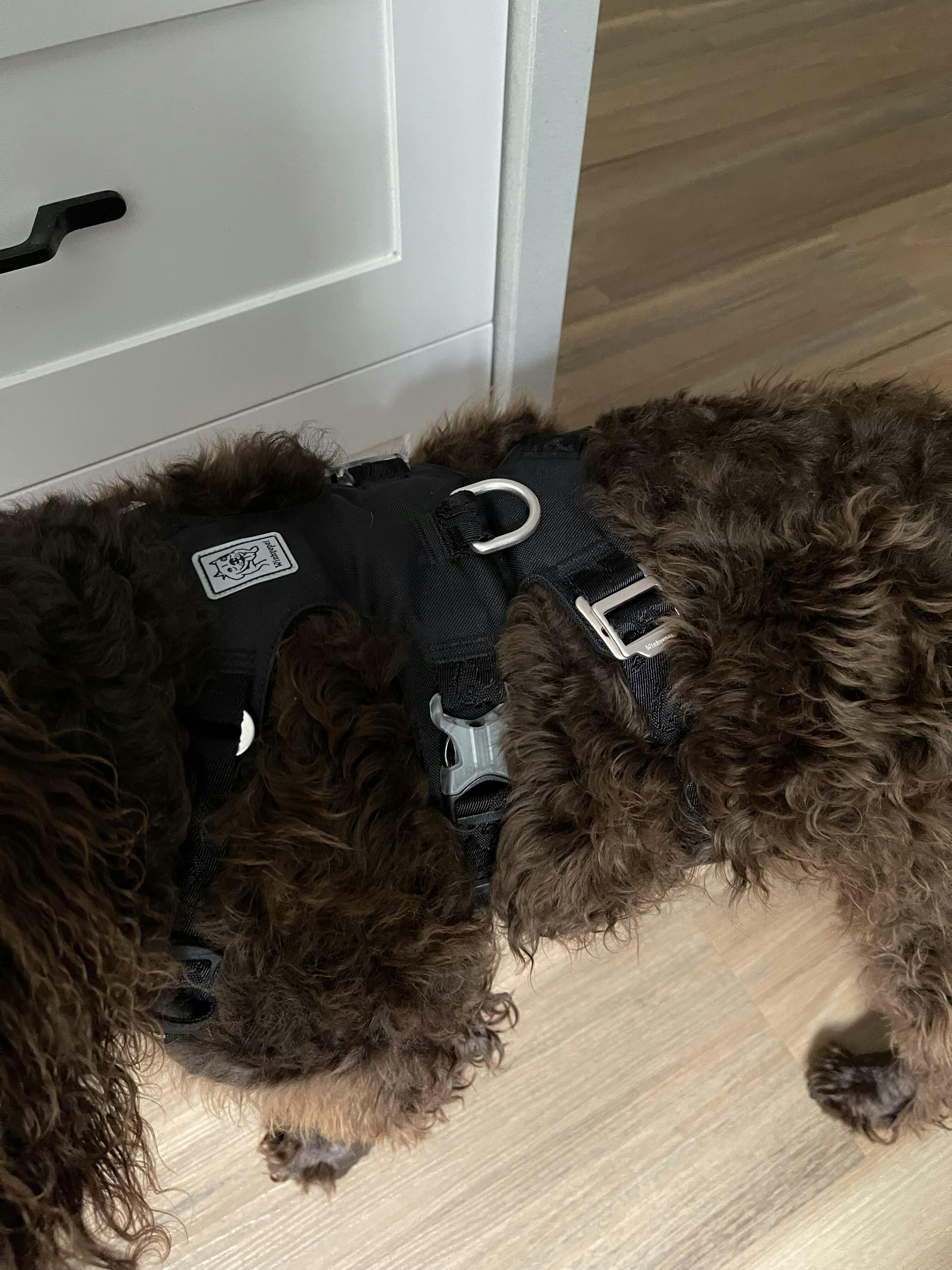 She seems very comfy walking/running and swimming in the harness.